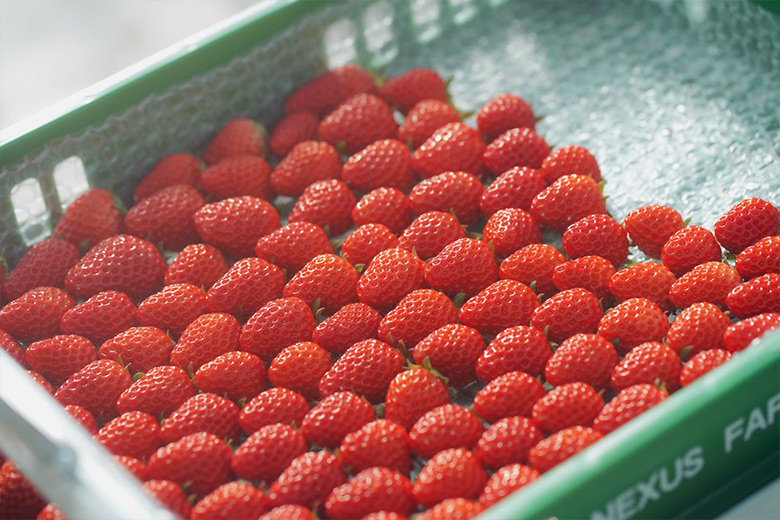 ネクサスファームおおくまでは、栽培環境、原材料から収穫物、出荷に至るまでの生産工程管理を徹底。収獲したいちごは、放射性物質非破壊検査装置で検査を行った後、一粒一粒、重さや形色、傷の有無で規格化されたルールごとに選別され出荷します。また、福島県が推進するF-GAP認証も取得し、持続的な農業経営に取り組んでいます。
