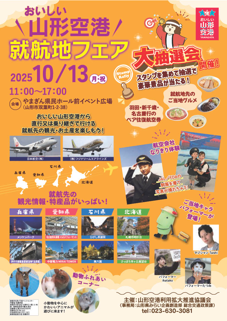 2025年10月13日(月・祝)11:00~17:00 やまぎん県民ホールイベント広場(0035 BY KIYOKAWAYA前)にて「おいしい山形空港 就航地フェア」を開催いたします。