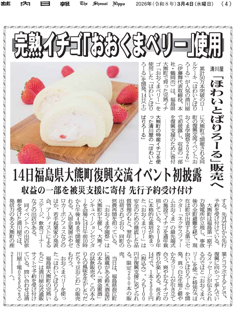 おおくまベリーを使用した新商品「ほわいとぱりろーる 福島県大熊町の完熟いちご」は、2026年2月27日(金)に清川屋公式通販サイトで先行予約を開始。3月14日(土)に大熊町で開催される「大熊町 復興交流イベント おおくま学園祭 2026『OKUMA ODYSSEY』」の清川屋ブースで初披露します。