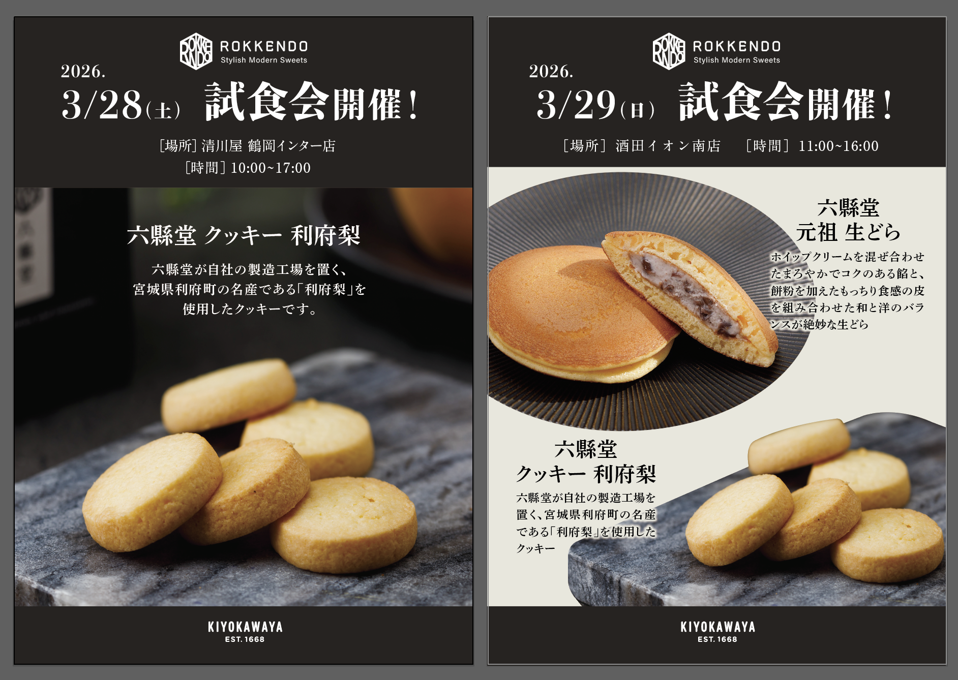 「六縣堂 元祖生どら」「六縣堂クッキー 利府梨」の試食を予定しています。